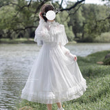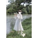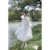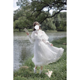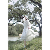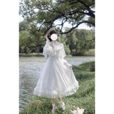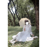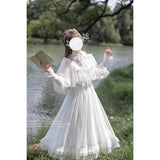 一瞬のきらめきを閉じ込めた純白のチュールケープワンピース。ふわりと揺れるドットチュールが、令嬢の凛とした気品を映し出し、クラシカルで優雅な佇まいを完成させます。繊細なチュールが幾重にも重なった身頃は、光を受けるたびに淡くきらめいています。袖はふんわりとしたボリュームをもたせ、手首に向かって絞られることでクラシカルなシルエットを強調し、裾にかけては細やかなプリーツとレースフリルが重なっています。透明感と夢のような優しさに満ちた、まるで絵本の1ページから抜け出してきたようなクラシカルドレス。