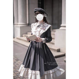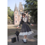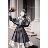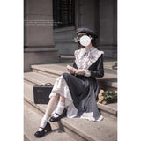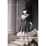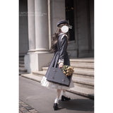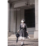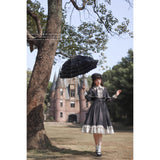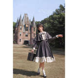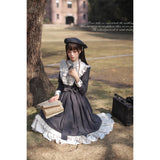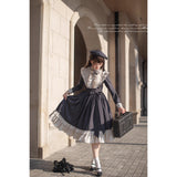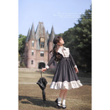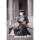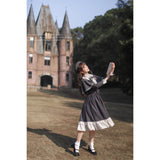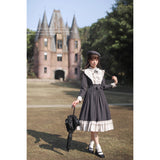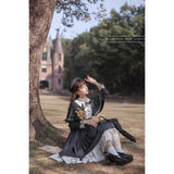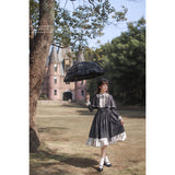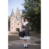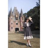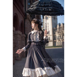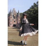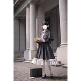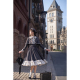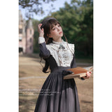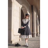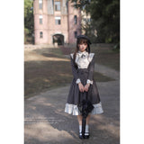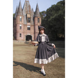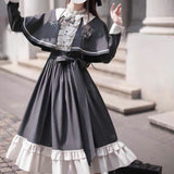 知的でレトロロマンな雰囲気が漂い、懐かしい物語の世界に迷い込んだような気分にさせてくれるクラシカルワンピースとケープ。深いチャコールグレーとアイボリーの優雅なコントラストが印象的。細かなストライプが端正な印象をもたらすワンピースは、胸元にあしらわれた大ぶりのフリルとクラシカルなボタン装飾がアクセントになっており、ウエストにはシルエットを美しく整えるリボンが結ばれています。スカートは贅沢に生地を取ったフレアラインで、裾に重ねられたアイボリーのフリルが歩くたびふわりと揺れ、優雅な存在感を放ちます。肩にかかるケープはワンピースと同じグレーストライプに白い縁取りが施されています。