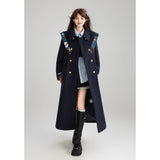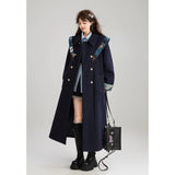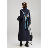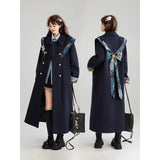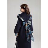 孤高の西洋画家が描いた名画を組み合わせたダブルブレストのロングコート。憧れの名画はいつの時代も心をときめかせてくれる。ショルダーラインから背中にかけて流れるスカーフ調の装飾が印象的で、背面に結ばれた大きなリボンがまるで絵画のワンシーンのように優雅さを演出しています。重厚感のあるロングシルエットに、金ボタンが品格を添え、内に秘めた可憐さと知的な強さを同時に表現しています。洗練とロマンが共存する、アートピースのようなクラシックモードコート。