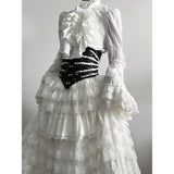解剖学や標本、病理的な美しさに着想を得たコルセット。浮かび上がる手骨。それはまるで遺された美の痕跡がワルツを奏でるかのような、静かで劇的な存在感を放ちます。ゴシックでダークな幻想の世界を纏ってみて。