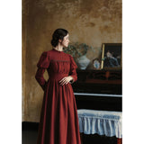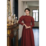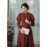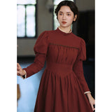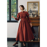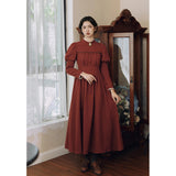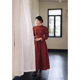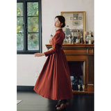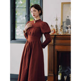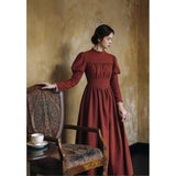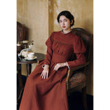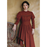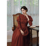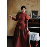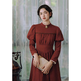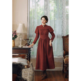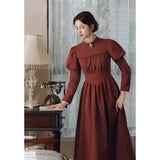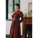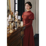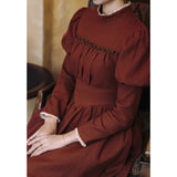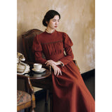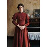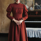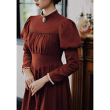 時を超えて美しさを語る、アンティークロマンなクラシカルワンピース。深みのあるテラコッタレッドが放つ、古き良き時代の温もりを纏った一着。高めのスタンドカラーとギャザーの入った胸元、ふんわりと膨らむスリーブがクラシカルなシルエットを描き、まるで19世紀の文芸サロンの淑女を思わせます。繊細なレースの縁取りがさりげなく上品さを添え、静かな知性と優雅さを併せ持つ佇まい。