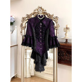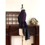 古城の舞踏会に現れる若き貴族、あるいはゴシック小説に登場する気高い令嬢を思わせるブラウス。胸元を縦に走るフリルが重なり、まるで中世の礼装のような厳かな気配を漂わせています。ドラマティックに広がるベルスリーブには繊細なブラックレースが重なり、動くたびに優雅でどこか妖しい余韻を演出。ウエストを美しく絞るコルセットライクな切り替えと背面のレースアップが、どこか退廃的でドラマティックなシルエットを形成しています。貴族の夜会、そして少し危うげなロマンを織り交ぜた世界観をイメージして制作された、気品と妖艶さが共存するデザイン。