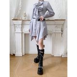 古城の舞踏会に現れる若き貴族、あるいはゴシック小説に登場する気高い令嬢を思わせるワンピース。シャープな襟元と整然と並ぶボタンが知的で禁欲的な印象を与える一方、ウエストを美しく絞る構築的なシルエットと背面のレースアップが、ゴシック調の気品と緊張感をさりげなく演出しています。裾へ向かって優雅に揺れるアシンメトリーのラインが印象的。貴族の夜会、そして少し危うげなロマンを織り交ぜた世界観をイメージして制作された、気品と妖艶さが共存するデザイン。
