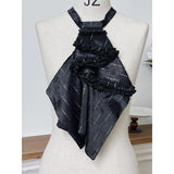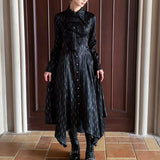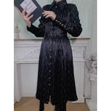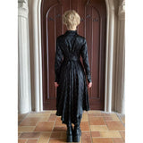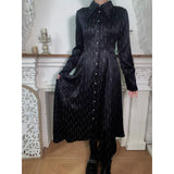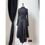 古城の舞踏会に現れる若き貴族、あるいはゴシック小説に登場する気高い令嬢を思わせるワンピース。シャープな襟元と整然と並ぶボタンが知的で禁欲的な印象を与える一方、ウエストを美しく絞る構築的なシルエットと背面のレースアップが、ゴシック調の気品と緊張感をさりげなく演出しています。裾へ向かって優雅に揺れるアシンメトリーのラインが印象的。貴族の夜会、そして少し危うげなロマンを織り交ぜた世界観をイメージして制作された、気品と妖艶さが共存するデザイン。