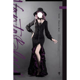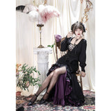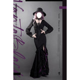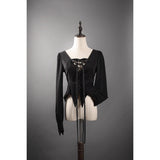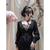 クラシカルなゴシックの精神を現代的に再構築した、静かな情熱と冷たい美が共存するブラウス。闇の中で微かに光を反射するような漆黒のエレガンスを纏う一着。胸元のリボンレースアップが繊細な官能を描き、ウエストを絞り込む構築的なラインがシルエットを劇的に演出します。裾はまるで闇夜の刃のように尖り、袖口のディテールが時を超えた優雅さを添えています。