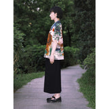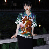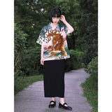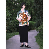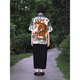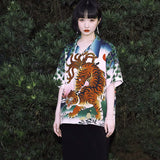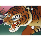 松林に潜む獰猛な豹虎を描いたシャツ。白い砂浜と青々とした松林が続く白砂青松と、豹虎が描かれています。筆致の迫力に宿る魂の咆哮。大胆不敵な筆遣いによって生き生きと表現されています。