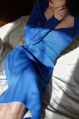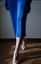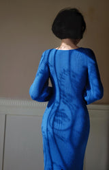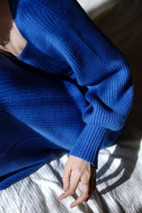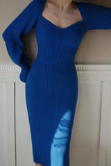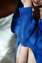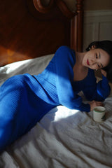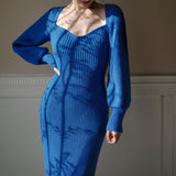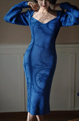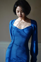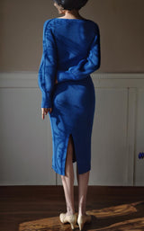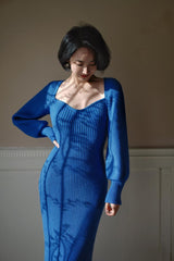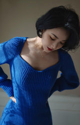 フレンチレトロな雰囲気が漂う群青色のニットワンピース。袖はふっくらとした膨らみがあり、首まわりはすっきりとした印象に見せてくれるスクエアネック。ウエストのくびれを強調させた美しい曲線美を魅せてくれるアイテムです。美しき煌めきで視線を奪って。