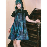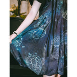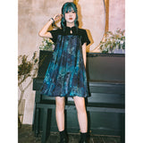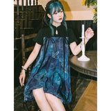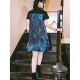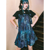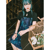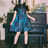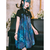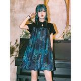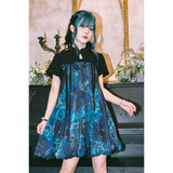 深藍の海に静かに浮かんでいるような神秘的なクラゲを描いたワンピース。裾部分を丸く膨らませたバルーンシルエットが特徴的。月明かりに照らされて、海の中で小さく青く光る星雲が幻想的な雰囲気を醸し出しています。ほんのり薫るチャイナっぽさに魅了されて。
