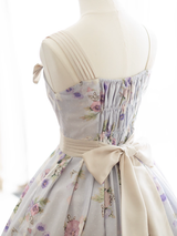 三色菫の花々のまわりを蝶々が舞っている情景を水彩で描いたクラシカルなジャンパースカート。パステルカラーの花びらは幻想的な雰囲気を与えてくれる。ウエスト位置が高く、バックにリボンが装飾されています。ふわりと広がるスカート部分がエレガントな雰囲気を演出してくれる。