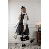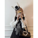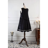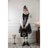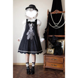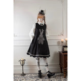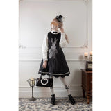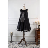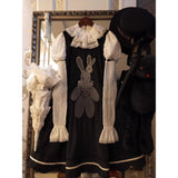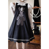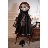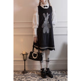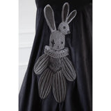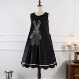 深みのあるブラック生地で仕立てられた、物語性を感じさせるクラシカルなジャンパースカート。アンティークなうさぎのぬいぐるみが刺繍されており、幻想的な世界観を描き出しています。シンプルなノースリーブデザインに、ゆったりと広がるシルエットが重なっています。甘さを抑えながらも可憐な印象を醸し出しています。どこか童話の一場面のような愛らしさと少しのミステリアスさを秘めた一着。