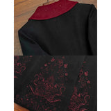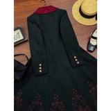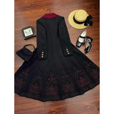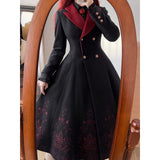 荘厳なゴシック様式の城を中心とした幻想的なモチーフを刺繍したクラシカルなコート。塔の尖塔やアーチ状の窓を持つ城が赤い糸で繊細に描かれており、その周囲には蝶や花、蔦のような植物模様が舞っています。鋭く絞られたウエストから裾へと大きく広がるシルエットが印象的。静謐さの奥に物語を秘めた、重厚で詩的なコート。
