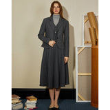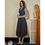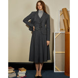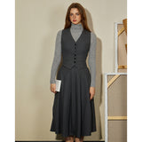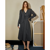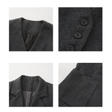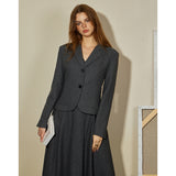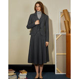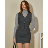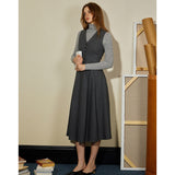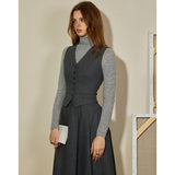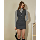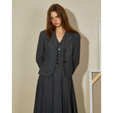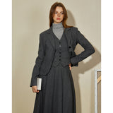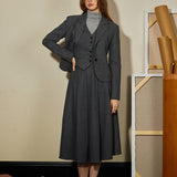 1990年代を彷彿とさせるクラシックなグレーのスーツスタイル。ウエストを強調するジャケットとベストは、スカートと組み合わせると、落ち着いたエレガンスを感じさせます。洗練された上品な印象を与えてくれるコーディネイト。時代を映し出すモダニティをあなたに。