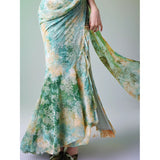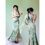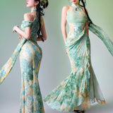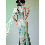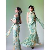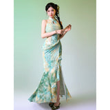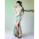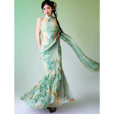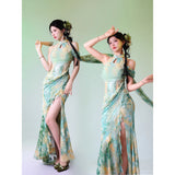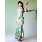 やわらかな光に満ちた神秘の森のようなチャイナワンピース。透き通るようなミントグリーンと淡いイエローが溶け合う水彩画風の生地に、繊細なレースが脇腹や裾にあしらわれ、まるで霞がかった森に咲く花のような儚さを感じさせます。歩くたびに風と踊るような軽やかさを持ち、まさに森の精霊が舞踏会に現れたかのようなデザイン。