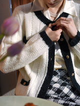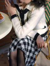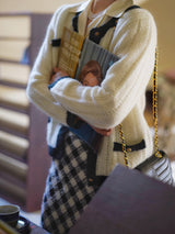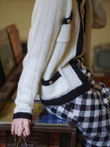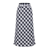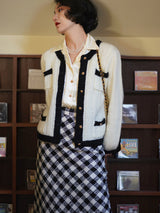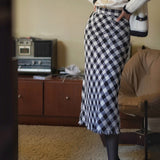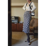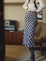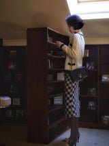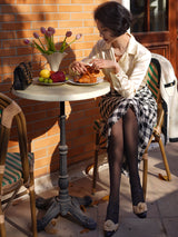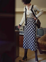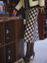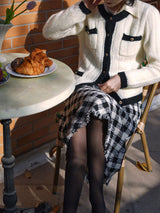 黒と白の格子縞がレトロな雰囲気を与えてくれるツイードスカート。ハイウエストなデザインで、脚を長く、すっきりとした印象に魅せてくれます。落ち着きのある色合いで、品よく着こなすことができるアイテム。エレガントな映画女優みたいな雰囲気に。