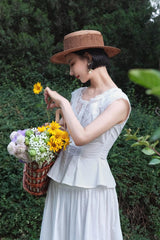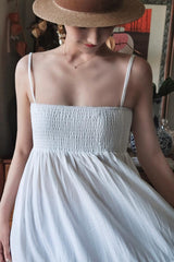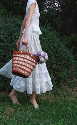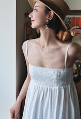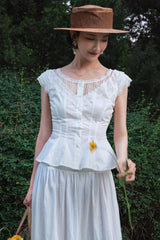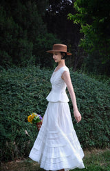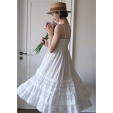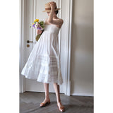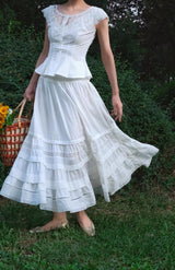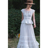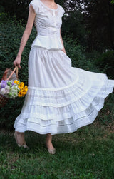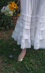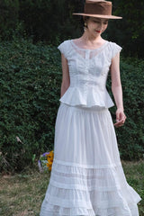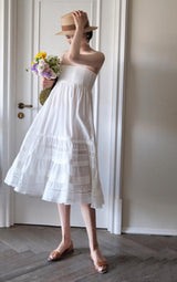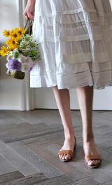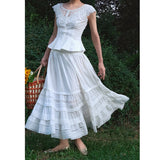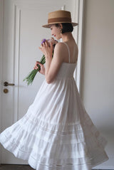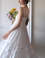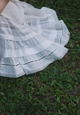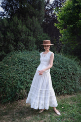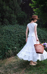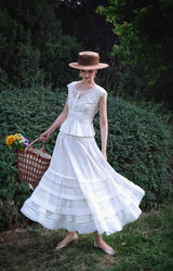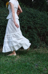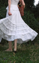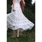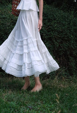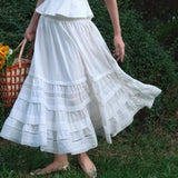 白地のレース刺繍が装飾されて、段を重ねたようなデザインのロングスカート。さらりとした触り心地が特徴的なコットン生地。ロング丈のスカートだけでなく、ミドル丈のキャミソールワンピースとしてもお召しいただけるアイテム。さりげなく優雅で、清純で上品な印象に。