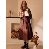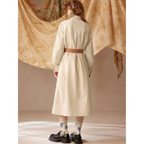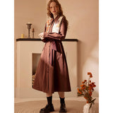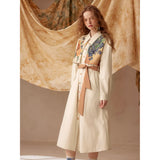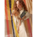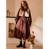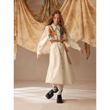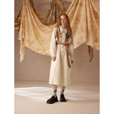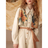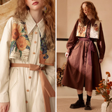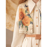 ゴッホの『花瓶の向日葵』と『アイリス』と『テオへの手紙』が描かれたベストワンピース。ベストとワンピースを組み合わせたデザインで、ウエストをリボンで結べるようになっており、襟部分とポケットの縁に刺繍が施されています。絵画を纏っているような芸術的なアイテム。