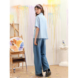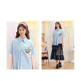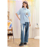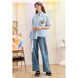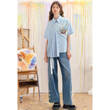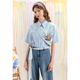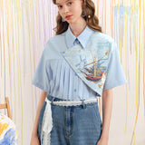 ゴッホが描いた『サントマリーの浜辺の釣り舟』にオマージュを捧げるアシンメトリーなブラウス。可愛らしい子猫も描かれています。フロント部分に施されたプリーツと、襟元から斜めにあしらわれた絵画が印象的。カジュアルなボトムスと合わせて、アートなアイテムを堪能してみて。