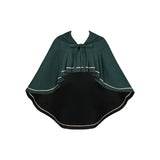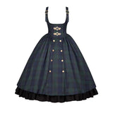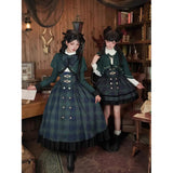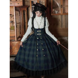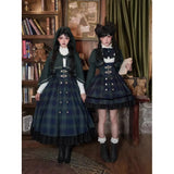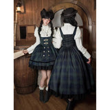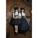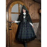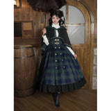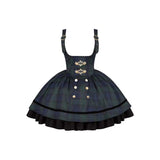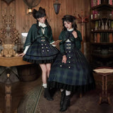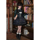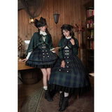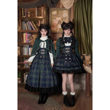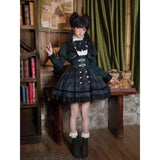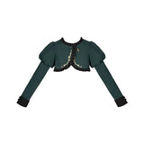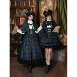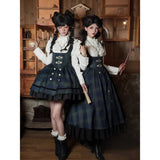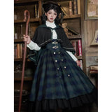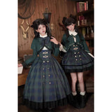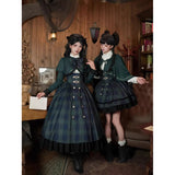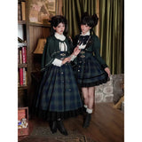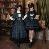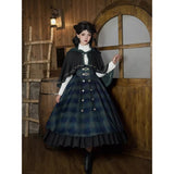 静謐で古書の香りを纏ったようなクラシカルな佇まいを描いたお洋服。深いグリーンとネイビーのチェック柄のジャンパースカートは、程よく張りのある生地とフロントに並ぶ金属ボタンが格調高い品格を醸し出しています。裾からのぞく黒のフリルが奥行きを生み、肩に膨らみを持たせたショートジャケットや、柔らかなドレープのあるケープが知的な印象を与え、ブラウスは高めのフリル襟と繊細なレース袖が清楚さを際立たせます。