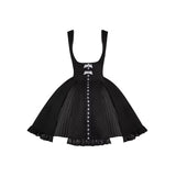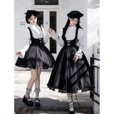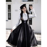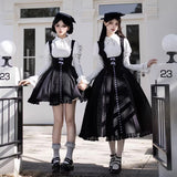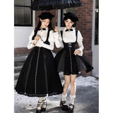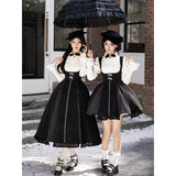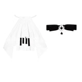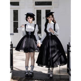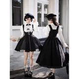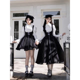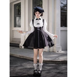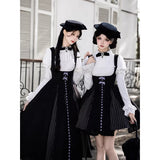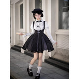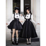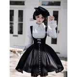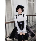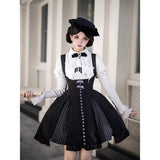 白と黒のコントラストを主旋律に据えた、ピアノの鍵盤をそのまま衣服に落とし込んだようなジャンパースカートとブラウス。ブラウスは白鍵を思わせる白を基調に、細かなフリルや立体的な胸元の装飾が音の立ち上がりのような雰囲気を醸し出しています。ジャンパースカートは深い黒を基調に縦へ流れる切り替えやピンタックが黒鍵の規則正しい並びを想起させ、歩くたびにリズムを刻むようなシルエットを描きます。楽譜の上を指が滑る瞬間の緊張感と美しさを纏った、知的でクラシカルな佇まい。