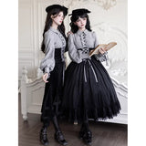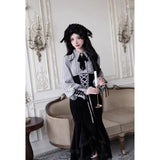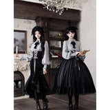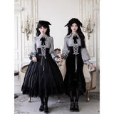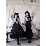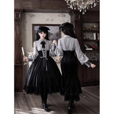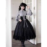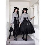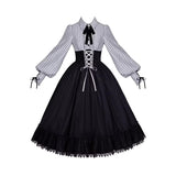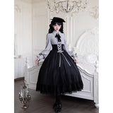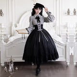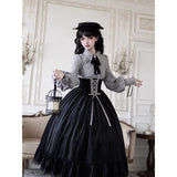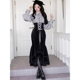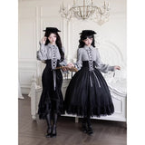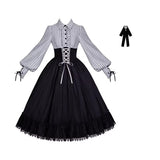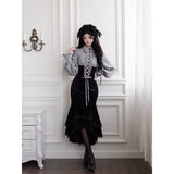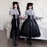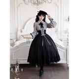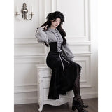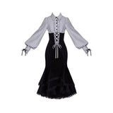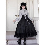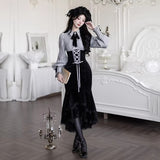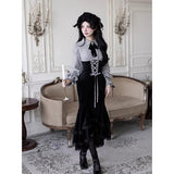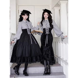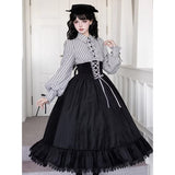 知的な端正さと、物語性を秘めたドッキングワンピース。縦縞のブラウスとハイウエストなコルセットスカートが一体となったアイテム。上半身に端正なシャツの佇まいを宿しながら、胸元からウエストにかけては編み上げのコルセットディテールとなっています。一方のワンピースはスカート部分が豊かな分量感とレースの縁取りによってクラシカルに広がり、もう一方は縦のラインを強調する落ち着いたマーメイドシルエットで、より静謐で大人びた印象を湛えています。