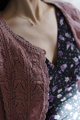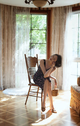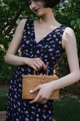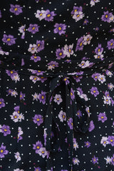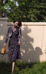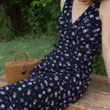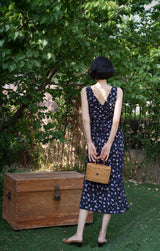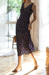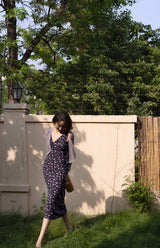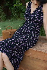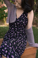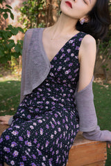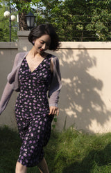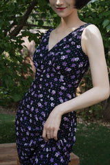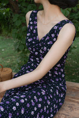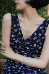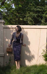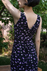 濃紺の地に本紫の花々が咲き誇ったノースリーブワンピース。比較的タイトなシルエットで、バックでリボンを結べるようになっています。ネックラインだけでなく、背中側もVネックとなったデザイン。華やかで優美な曲線美を魅せてくれる。