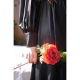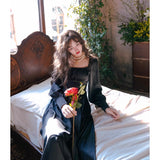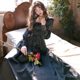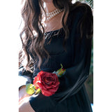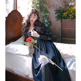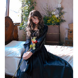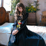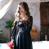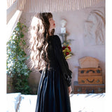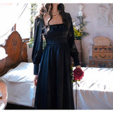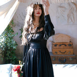 禁断の魔性へと変貌する美しき王妃に。深みと艶めきのある”黒”に魅せられるエレガントなワンピース。ウエスト位置が高く、優雅なドレープ感が特徴的。スクエアネックのデザインは、輝きのある首飾りとの相性が抜群。