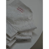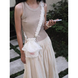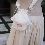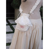 朝露に濡れた白い庭園を静かに歩く少女と、やわらかな光に包まれた清らかな時間をイメージしたバッグ。やさしいオフホワイトの生地は、まだ日差しが強くなりきらない朝の空気や、淡く霞んだ光の中で揺れる花々の気配を思わせ、重ねられたレースのフリルは、風にそよぐ花びらや、庭に咲く白い花の層のように軽やかに広がります。刺繍に浮かぶ花模様は、静かに咲き続ける小さな命の気配を繊細に映し出し、見るたびに穏やかな時間の流れを感じさせます。くしゅっと寄せられた口元のフォルムは、ほんの少し秘密をしまい込む巾着のようで、日常の中にある小さな大切なものをやさしく包み込む存在に見えます。