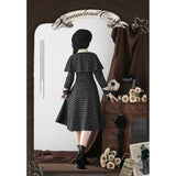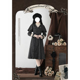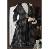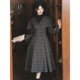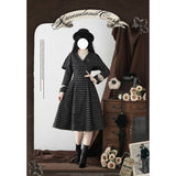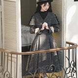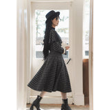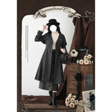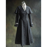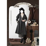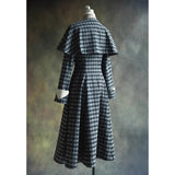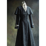 重厚なチェック柄のウール地が静かな光を湛え、まるで古書館の空気をそのまま纏ったような、端正さと物語性を併せ持つウールコート。肩を包み込むように広がるクラシカルなケープがシルエットに陰影を与え、ダブルボタンの端正な配置とウエストにかけての緩やかな絞りが、凛としたヴィンテージ調のエレガンスを引き立てています。スカート部分は重厚に広がり、歩みのたびに柔らかな揺れを生み、袖口に施された明るい色のカフスが控えめなアクセントとして全体に知性と洗練を添えています。静謐な図書室や冬の朝の光がよく似合う、19世紀の物語から抜け出したようなクラシカルで幻想的なコート。