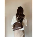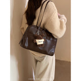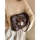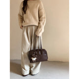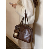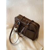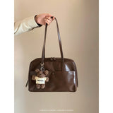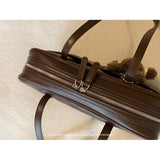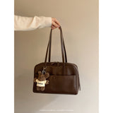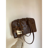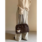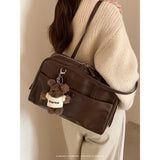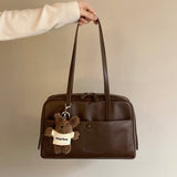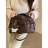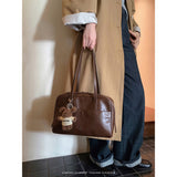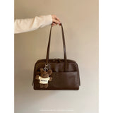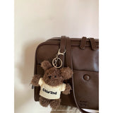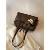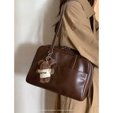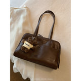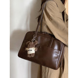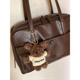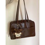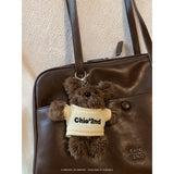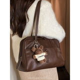 クラシックでレトロなデザインが特徴的なブラウンのショルダーバッグ。やわらかな光沢感のある質感と、かわいらしいテディベアのチャームがアクセントとなり、カジュアルにもエレガントにも合わせられます。