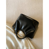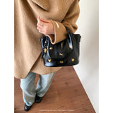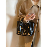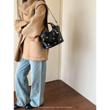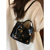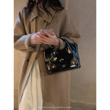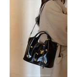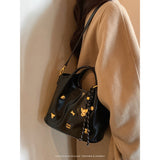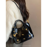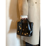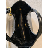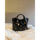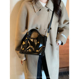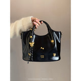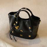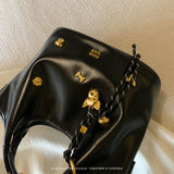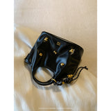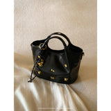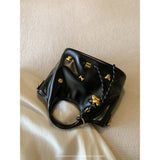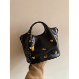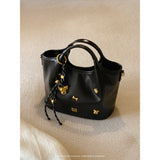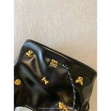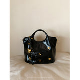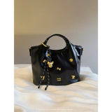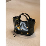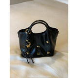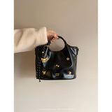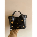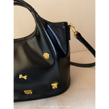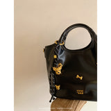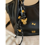 可愛らしい金色の子犬や骨、足跡があしらわれた艶やかなレザーハンドバッグ。ストラップをつけることでショルダーバッグにもすることができます。柔らかなラインがフェミニンな印象を与えつつ、遊び心とエレガントな雰囲気を醸し出しています。