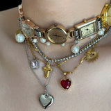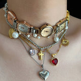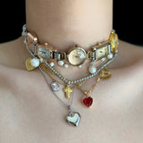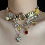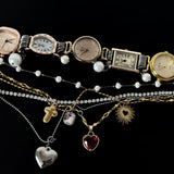 ヴィンテージ感あふれる時計モチーフと多彩なチャームが組み合わさったチョーカーネックレス。複数の時計フェイスが連なり、パールやゴールドチェーン、そしてハートやクロス、サンモチーフなどのチャームが重層的に配置されています。クラシックでエレガントな要素と個性的な遊び心を兼ね備えており、日常のスタイルを格上げするアクセントアイテム。