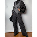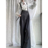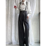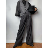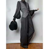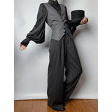 ダークグレー地に細いピンストライプ柄を配した、ハイウエストでワイドシルエットのロングパンツ。ウエスト部分には二列のボタンが並び、クラシカルかつマニッシュな雰囲気を演出。ゆったりとしたシルエットが、品格と存在感を兼ね備えています。