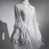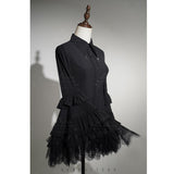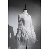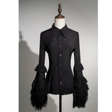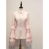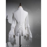 エレガントな王侯貴族のお嬢様みたいに演出してくれるブラウス。フリルやレースがたっぷり施されており、華やかでフェミニンな印象を与えます。バックには編み上げデザインが施されており、襟先には十字架が装飾されています。ディテールの細かさが全体のデザインを引き立てています。