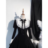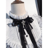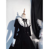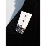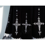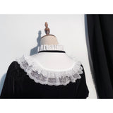 静謐な美しさと神聖さを演出したゴシックワンピース。漆黒のベルベットが静かに光を吸い込み、重力を帯びたように落ちるスカートが円環を描いています。高く整えられた白いフリル襟と袖口のコントラストが、修道院的な清廉さと儀式の気配を纏わせています。裾にあしらわれた繊細なレースと十字架の刺繍は、祈りと静かな反抗を同時に宿し、動くたびに影のような余韻を残します。