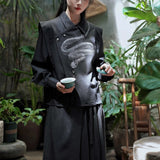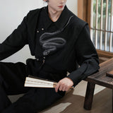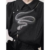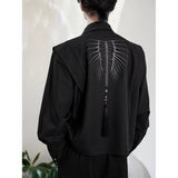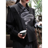 蛇骨をモチーフにした重厚な刺繍入りのアシンメトリートップス。蛇骨を象った立体的な刺繍デザインがフロントやバックに大胆に配置されています。装飾的なタッセルや、アシンメトリーなフロントデザインも特徴的。伝統的な要素をモダンに昇華させたアイテム。