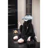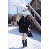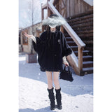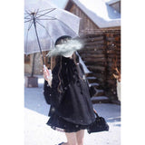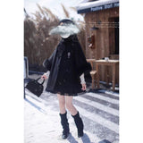 闇夜に咲く黒薔薇のように気品と神秘を纏うケープコート。深いブラックの生地が静かに光を吸い込み、袖口のファーが優雅な陰影を描き出します。首元のリボンタイと胸元のブローチがクラシカルなアクセントとなり、モノトーンの世界に上品な物語を添えるデザイン。冷たい冬の空気の中で、凛として美しく佇む淑女のための、エレガントで退廃的なロマンを感じさせる一着。