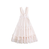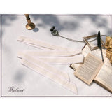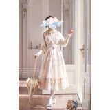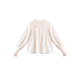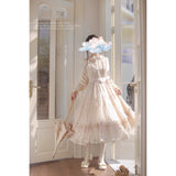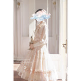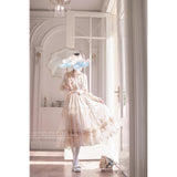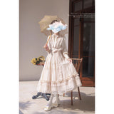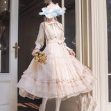 陽だまりの午後を思わせるアンティークロマンティックなジャンパースカートとフリルリボンブラウス。ジャンパースカートはアイボリー地に繊細なフリルとレースを幾重にも重ね、柔らかな光を纏うようなテクスチャーが特徴的。リボンベルトがウエストを優しく結び、クラシカルなシルエットを描きます。ブラウスは高めのフリル襟とピンタックをあしらい、袖口にはギャザーを寄せた上品なボリューム感。19世紀の令嬢が午後の庭園をそっと歩くような、静謐で詩的な気品が漂います。