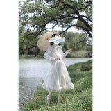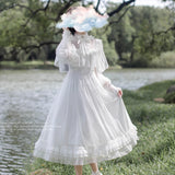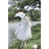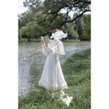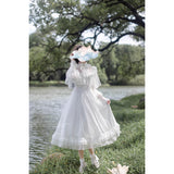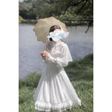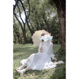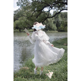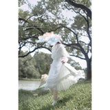 一瞬のきらめきを閉じ込めた純白のチュールケープワンピース。ふわりと揺れるドットチュールが、令嬢の凛とした気品を映し出し、クラシカルで優雅な佇まいを完成させます。繊細なチュールが幾重にも重なった身頃は、光を受けるたびに淡くきらめいています。袖はふんわりとしたボリュームをもたせ、手首に向かって絞られることでクラシカルなシルエットを強調し、裾にかけては細やかなプリーツとレースフリルが重なっています。透明感と夢のような優しさに満ちた、まるで絵本の1ページから抜け出してきたようなクラシカルドレス。
