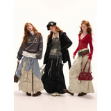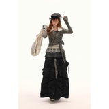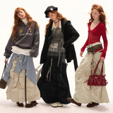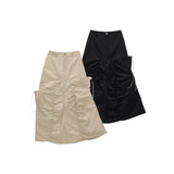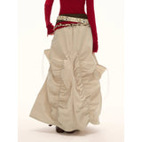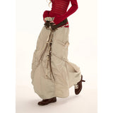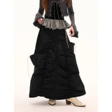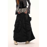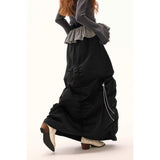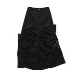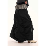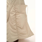 光沢感のあるナイロン調素材を使用した、立体的なドレープが印象的なロングスカートです。前後に配されたギャザー切り替えが柔らかな曲線を描き、歩くたびに豊かな表情を生み出します。両サイドにはドローコード付きのビッグポケットを備え、カジュアルな機能性とモードなデザイン性を両立。ボリュームのあるシルエットながら軽やかな着用感で、コーディネートにドラマティックなアクセントを加える一枚。