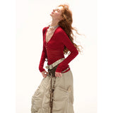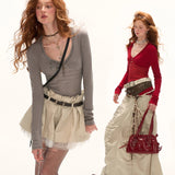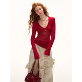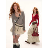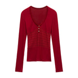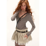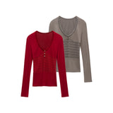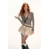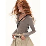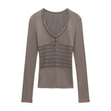胸下からウエスト部分にかけて繊細なレース編み風の透かし模様をあしらったカットソー。小ぶりのボタンが縦に並び、身体のラインに沿ったフィット感がありながらも、柔らかな素材感で女性らしいシルエットを演出します。シンプルながらも装飾性のあるデザインが特徴的。