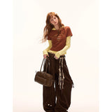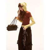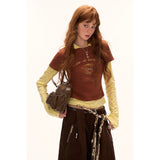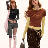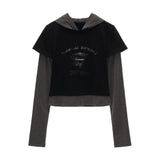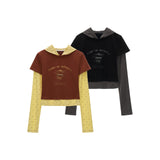 ドット柄のフード付きの長袖インナーと、ブランドロゴを施したTシャツをレイヤードしたデザインのカットソー。胸元にはロゴと装飾的なグラフィックプリントがあしらわれ、カジュアルかつ遊び心のあるスタイルを演出しています。