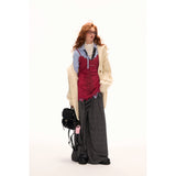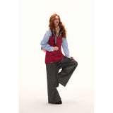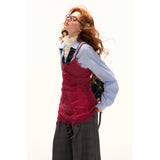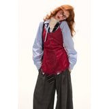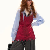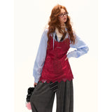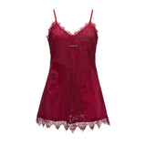 深みのある赤色に繊細なレースを組み合わせた、ランジェリーライクなデザインのキャミソール。異素材をパッチワークのように切り替えた構築的なディテールが特徴で、裾はスカラップ状のレーストリムでフェミニンに仕上げられています。デコルテを美しく見せる華奢なストラップと、艶やかなスウェードの質感が印象的。
