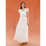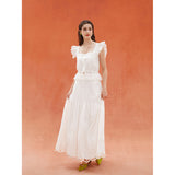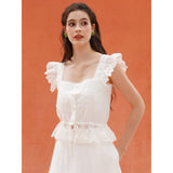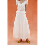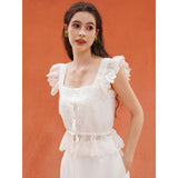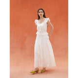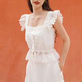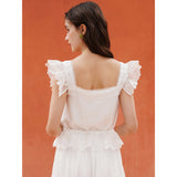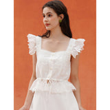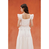 砂漠の大地で花をつけたサボテンを刺繍したビスチェトップス。フリル袖とスクエアネックが印象的で、身頃のレース刺繍は立体的で繊細。ウエストにはドローストリングがあり、絞ることでメリハリのあるシルエットに。ガーリーさと上品さを兼ね備えた一枚。