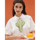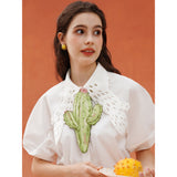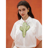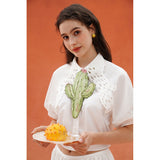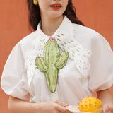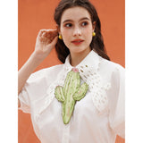 砂漠の大地で花をつけたサボテンの刺繍ネクタイ。淡いグリーンの刺繍糸で紡がれたサボテンに、淡いピンクの小さな花があしらわれています。内に秘めた強さ、そして時折見せる繊細な美しさを表現しています。