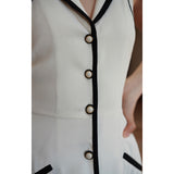 時代を超えて愛されるタイムレスなエレガンス。削ぎ落とされた美しさを表現した洗練のシルエット。オフホワイトを基調とし、ブラックのパイピングがアクセントとなったホルターネックワンピース。ボタンのディテールには、繊細な技巧とクラシックなムードが宿し、スカート部分は歩くたびに揺れる、計算されたシルエットとなっています。90年代のランウェイから生まれた、エレガンスの再解釈をあなたに。
