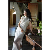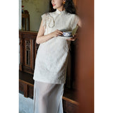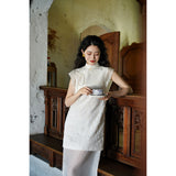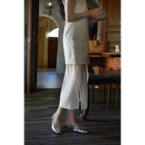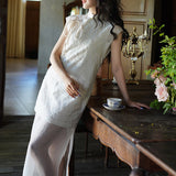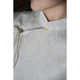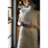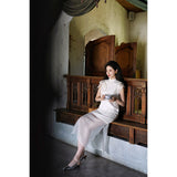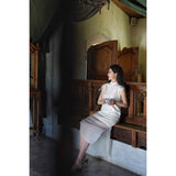 東洋の美学をモダンに刷新したチャイナワンピース。異素材の切り替えデザインで、クラシカルながら現代的な印象に仕上げました。施された立体的なジャカード織りが、繊細かつ存在感ある陰影を生み出し、生地の表情に動きと深みを与えます。上品に脚線美を引き立て、縦のラインを強調してくれる。洗練されたディテールの積み重ねが息づいています。