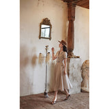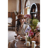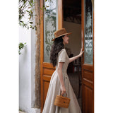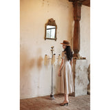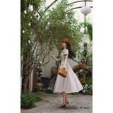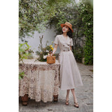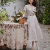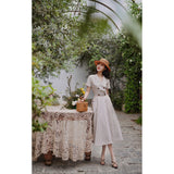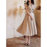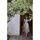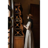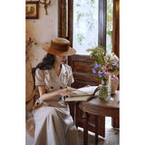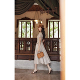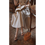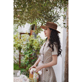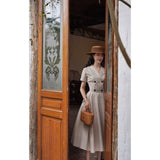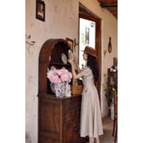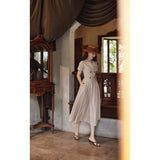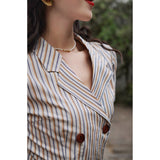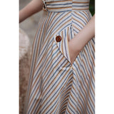 1950年代を想起させるクラシックなワンピース。霧がかったブルーとイエローブラウンの細いストライプ柄のアイテム。襟は鎖骨のくぼみにぴたりと沿い、上半身は体に沿うシルエットながら、動きやすさを考慮して程よいゆとりを残しています。サイドポケットの折り返し部分には赤茶色の木製ボタンが一粒あしらわれており、古き良き時代を彷彿とさせる懐かしさを感じさせます。スカート部分はふわりと広がるエアリーなカーブを描ます。クローゼットに欠かせないタイムレスな魅力を放つワンピース。