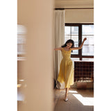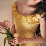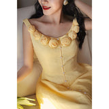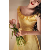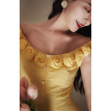 ロマンティックな雰囲気を纏った上品でエレガントなワンピース。手作業で仕上げた立体的な薔薇の花が咲き誇り、視線を惹きつけます。オフショルダー風のネックラインは何度も調整を重ね、露出しすぎず肩やデコルテを美しく見せるバランスに。ウエストは高めの位置で切り替え、体のラインに自然に寄り添いながら、くびれを強調しています。スカートは二重仕立てで落ち感を加え、歩くたびにふんわりと揺れる美しいシルエット。幻想的な雰囲気を纏ったワードローブに欠かせない一着。