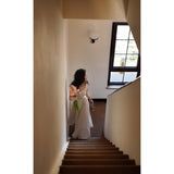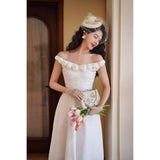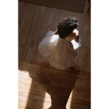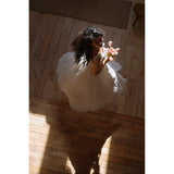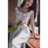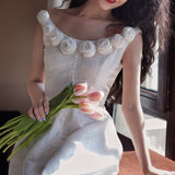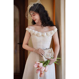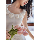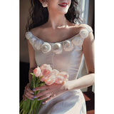 ロマンティックな雰囲気を纏った上品でエレガントなワンピース。手作業で仕上げた立体的な薔薇の花が咲き誇り、視線を惹きつけます。オフショルダー風のネックラインは何度も調整を重ね、露出しすぎず肩やデコルテを美しく見せるバランスに。ウエストは高めの位置で切り替え、体のラインに自然に寄り添いながら、くびれを強調しています。スカートは二重仕立てで落ち感を加え、歩くたびにふんわりと揺れる美しいシルエット。幻想的な雰囲気を纏ったワードローブに欠かせない一着。