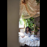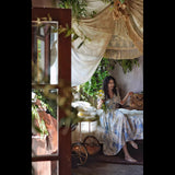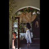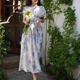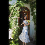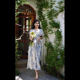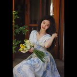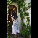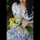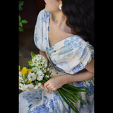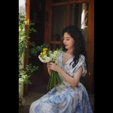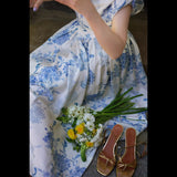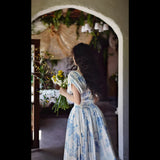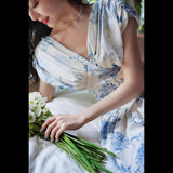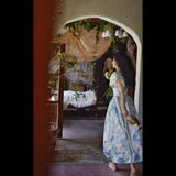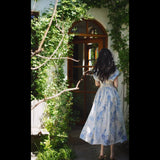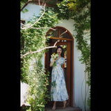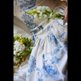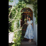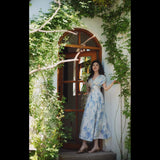 青と白の余白に咲く、青花磁器から着想を得たワンピース。Vネックとドロップショルダーのラインは、アンティークドレスのような優雅さを残しつつ、すっきりとしたAラインシルエットが、クラシックとモダンのバランスを美しく整えています。まるで午後の庭にふわりと咲いた、初夏のアジサイのような、どこか忘れられない美しさを放っています。“ひと目で恋に落ちる”ワンピース。